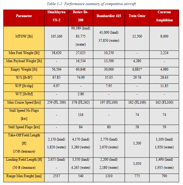 This was my first aircraft design project, and I used it as an opportunity to apply directly what I had learned with Raymer’s text. I started with an overview of similar aircraft, including their geometry, performance, and aerodynamics. This was my first time reading the famous Jane’s All The World’s Aircraft, and the data was compiled into a table. This served to guide the following sizing works and was used to compare the performance at the end of the design.
