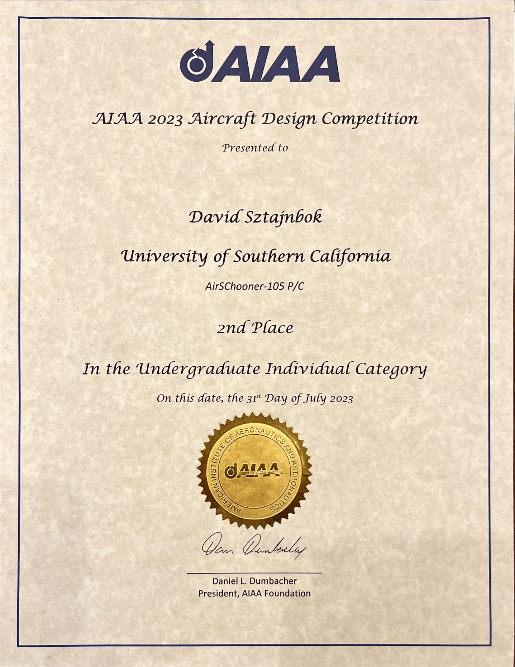 To my surprise, this report was awarded second place in the competition! It now lives in the AIAA’s website. As a nice bonus, I received a fancy certificate and some good money. Good stuff!