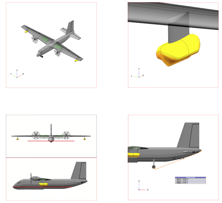 The layout also included provisions for several different components of the aircraft, and was done using OpenVSP. Namely, the propulsion system was properly sized, including the required fuel volume, and appropriate space claim was allocated in the wings (green containers on the left iso-picture). The aircraft’s waterline was also considered when designing and placing the wingtip floats and the hull’s cross-section, done with OpenVSP’s sectioned volume capabilities. Other practical considerations were analyzed, such as tail striking, loading/unloading provisions, etc.